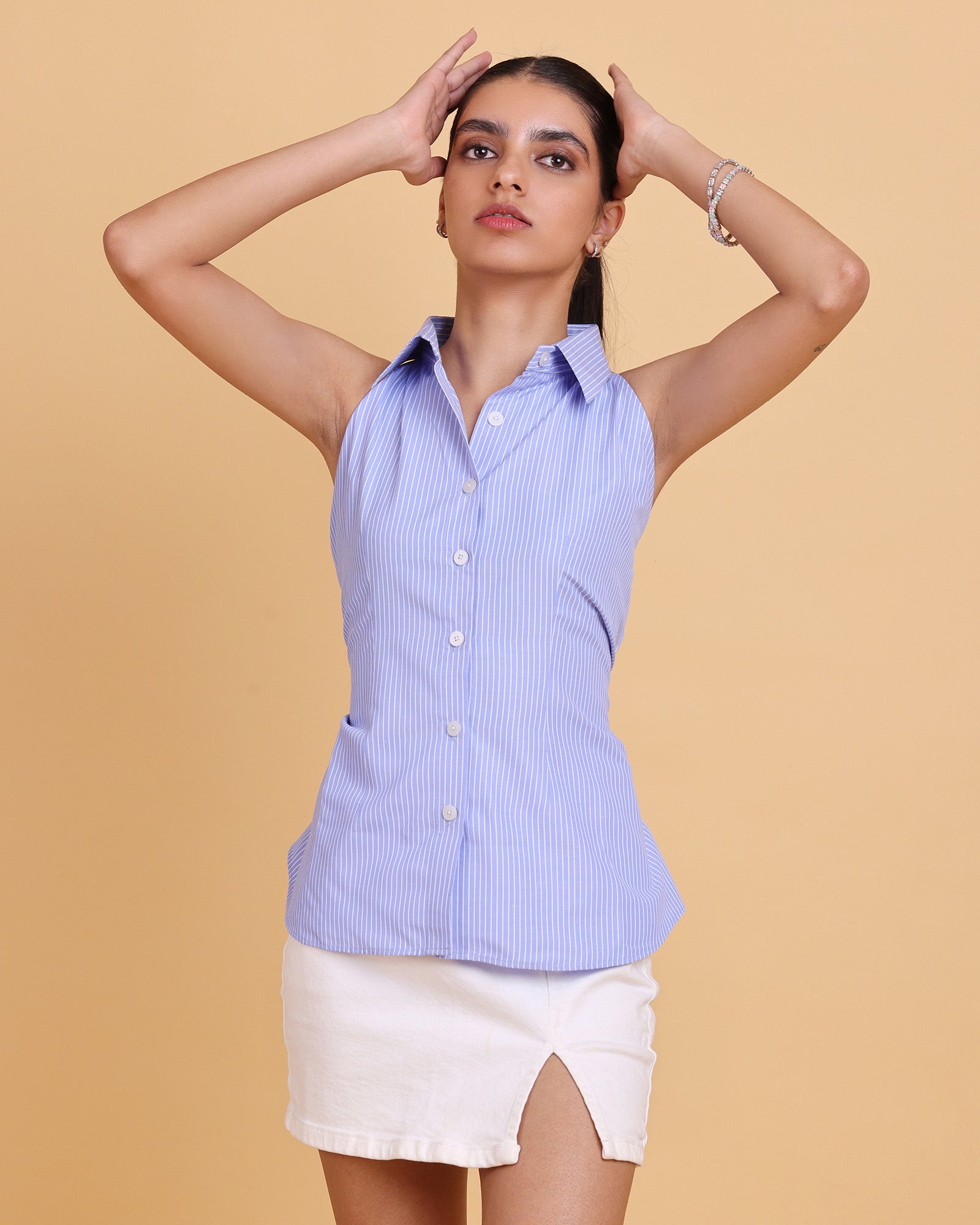 Crisp blue-and-white pinstripes meet a sculpted, sleeveless silhouette in the Daina Shirt. The spread collar frames the neckline with effortless poise, while subtle waist shaping and a clean button placket create a refined, versatile piece for day-to-night sophistication.