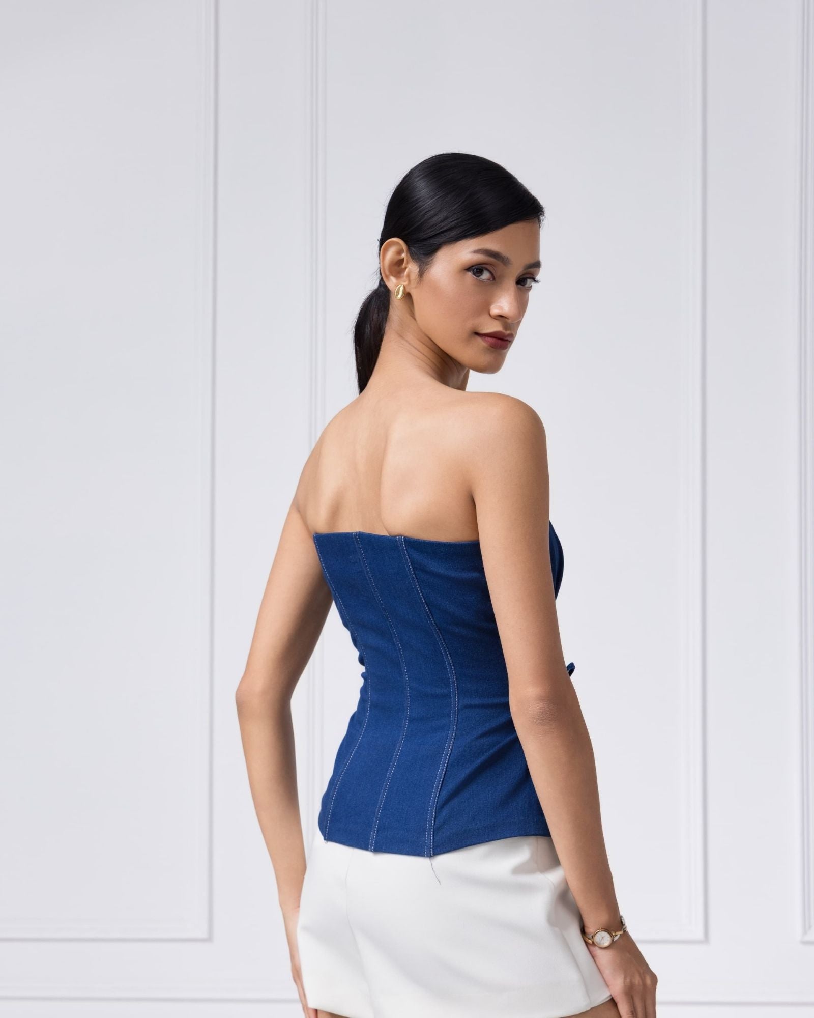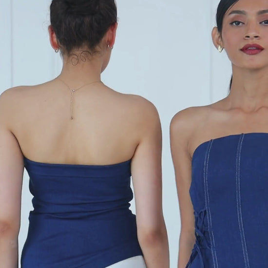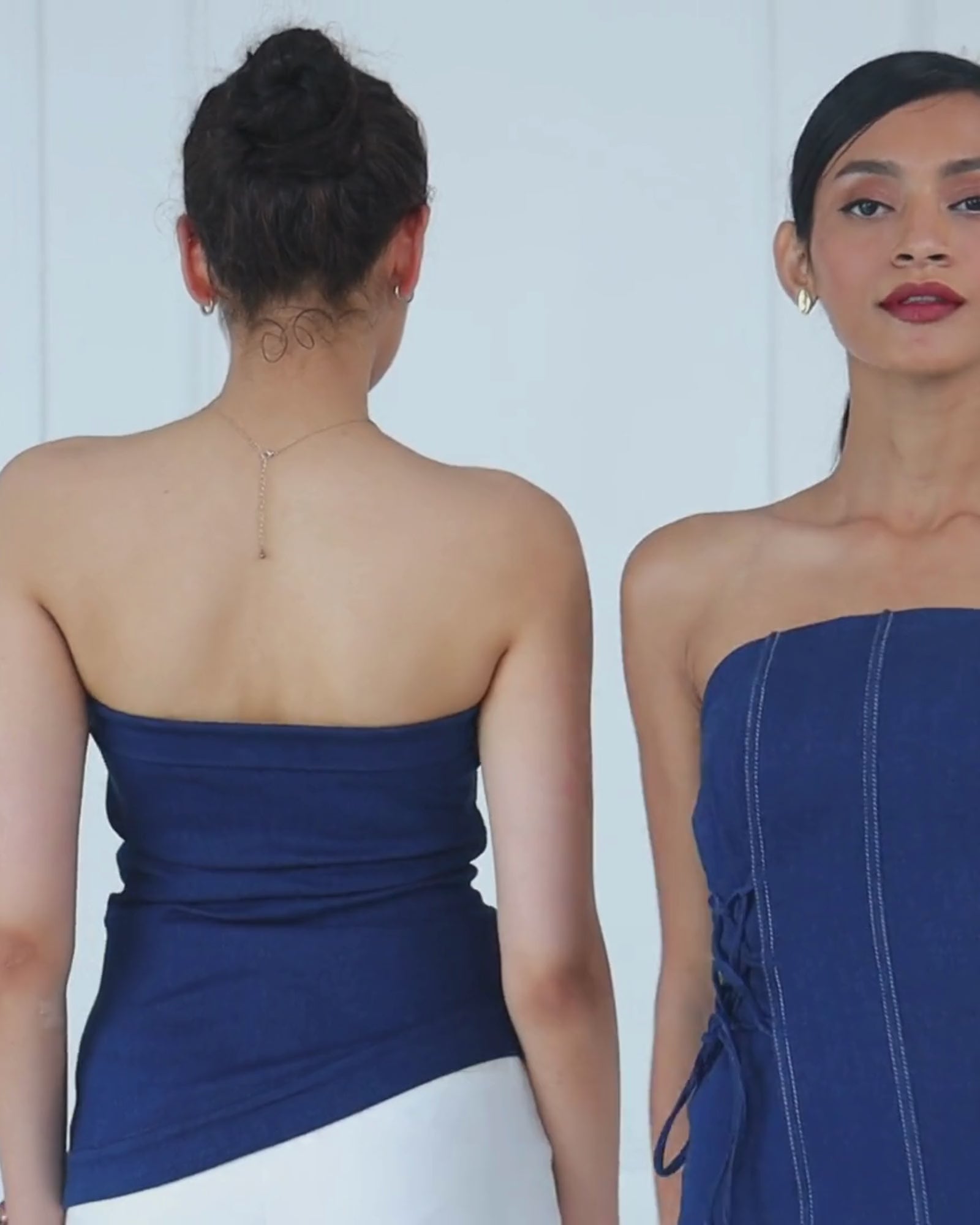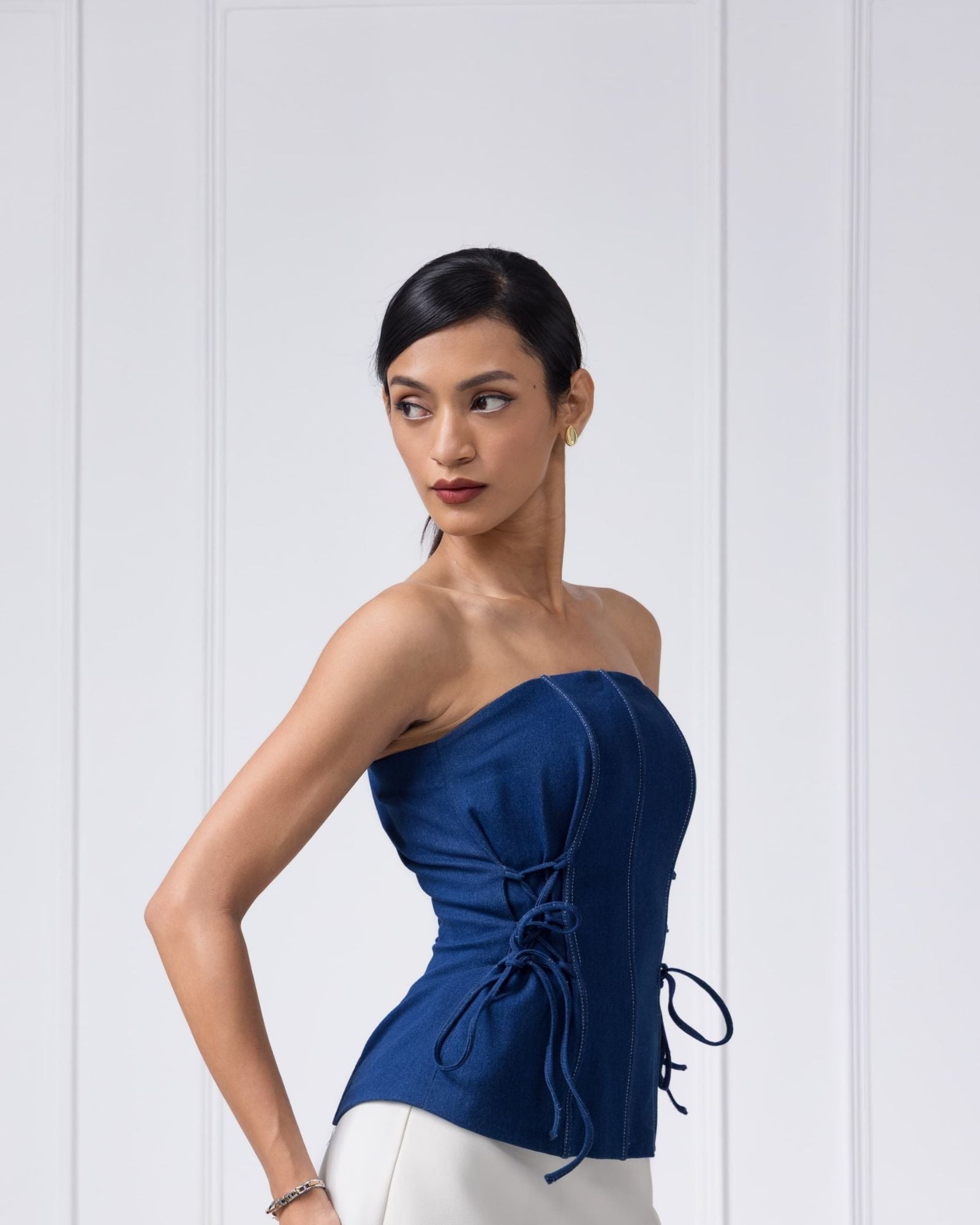 THE DENIM CINCH TOP redefines structure with a whisper of sensuality. Crafted in deep indigo, its corset-inspired seams and side cinch details sculpt the silhouette while maintaining an air of understated ease. The strapless cut allows the piece to transition seamlessly from day to night, embodying modern minimalism with a touch of edge.