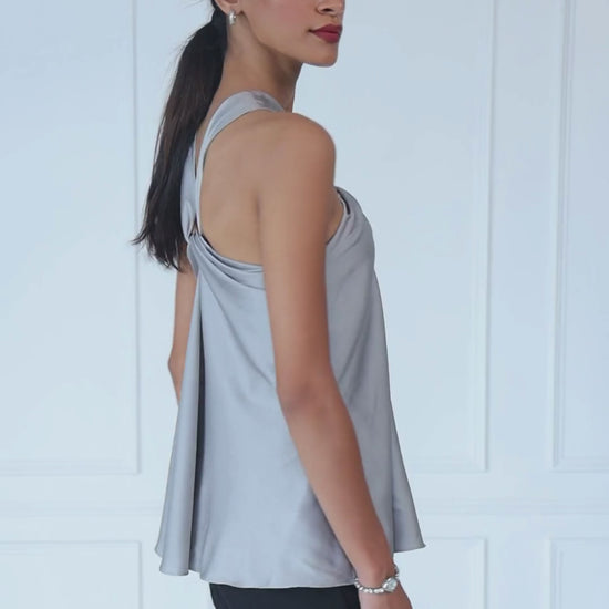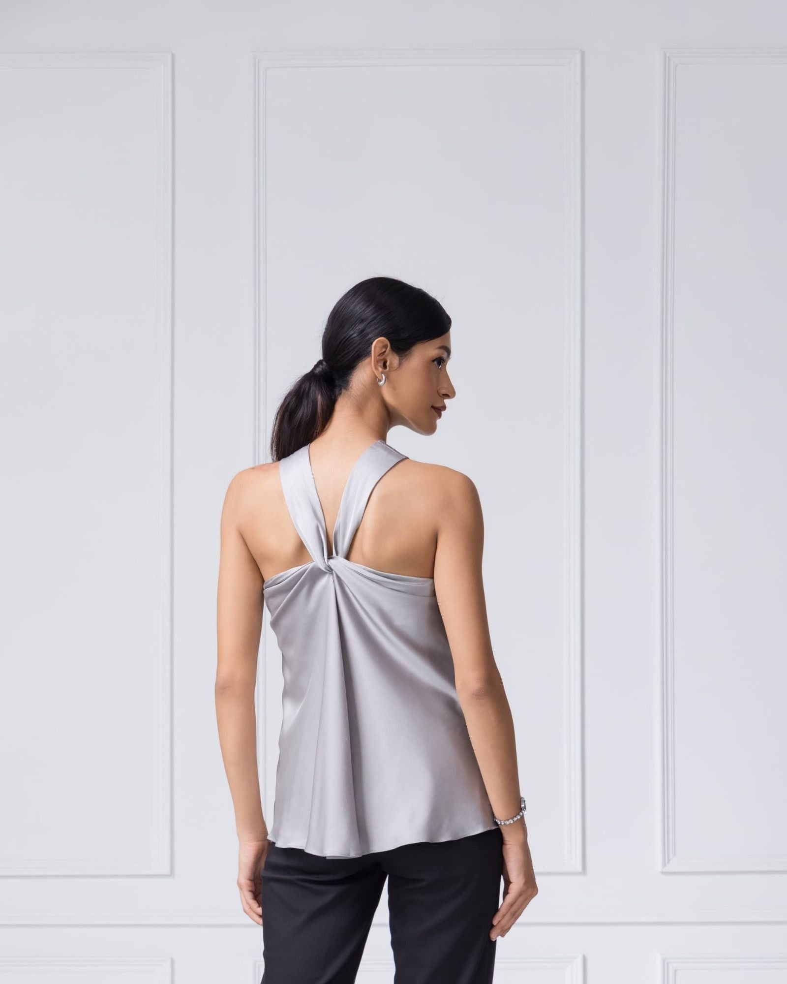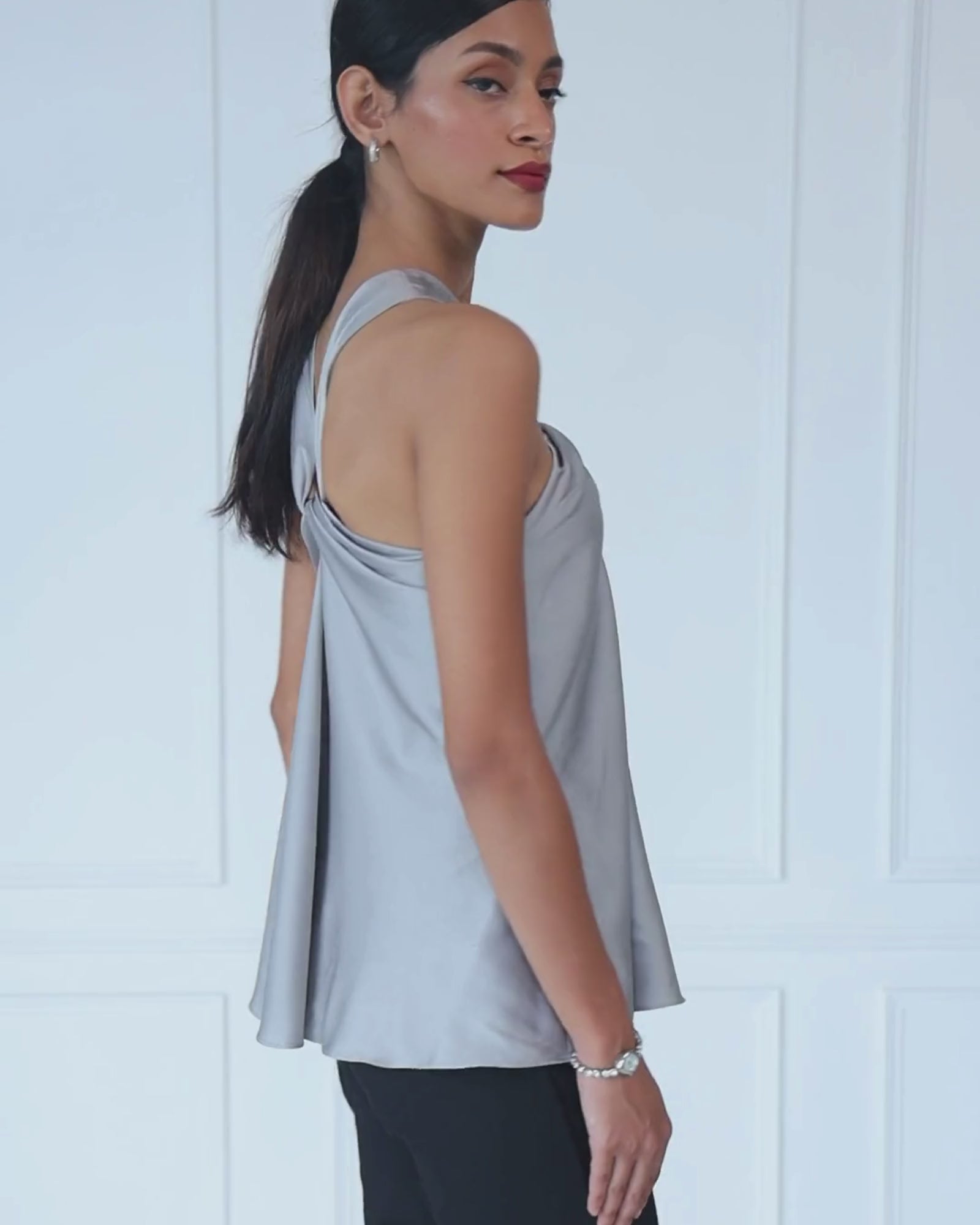 An elegant study in form and flow, THE SILVER SLIP TOP mirrors the rippling patterns of water touched by moonlight. The central knot gathers fluid satin into sculptural folds, balancing softness with structure.