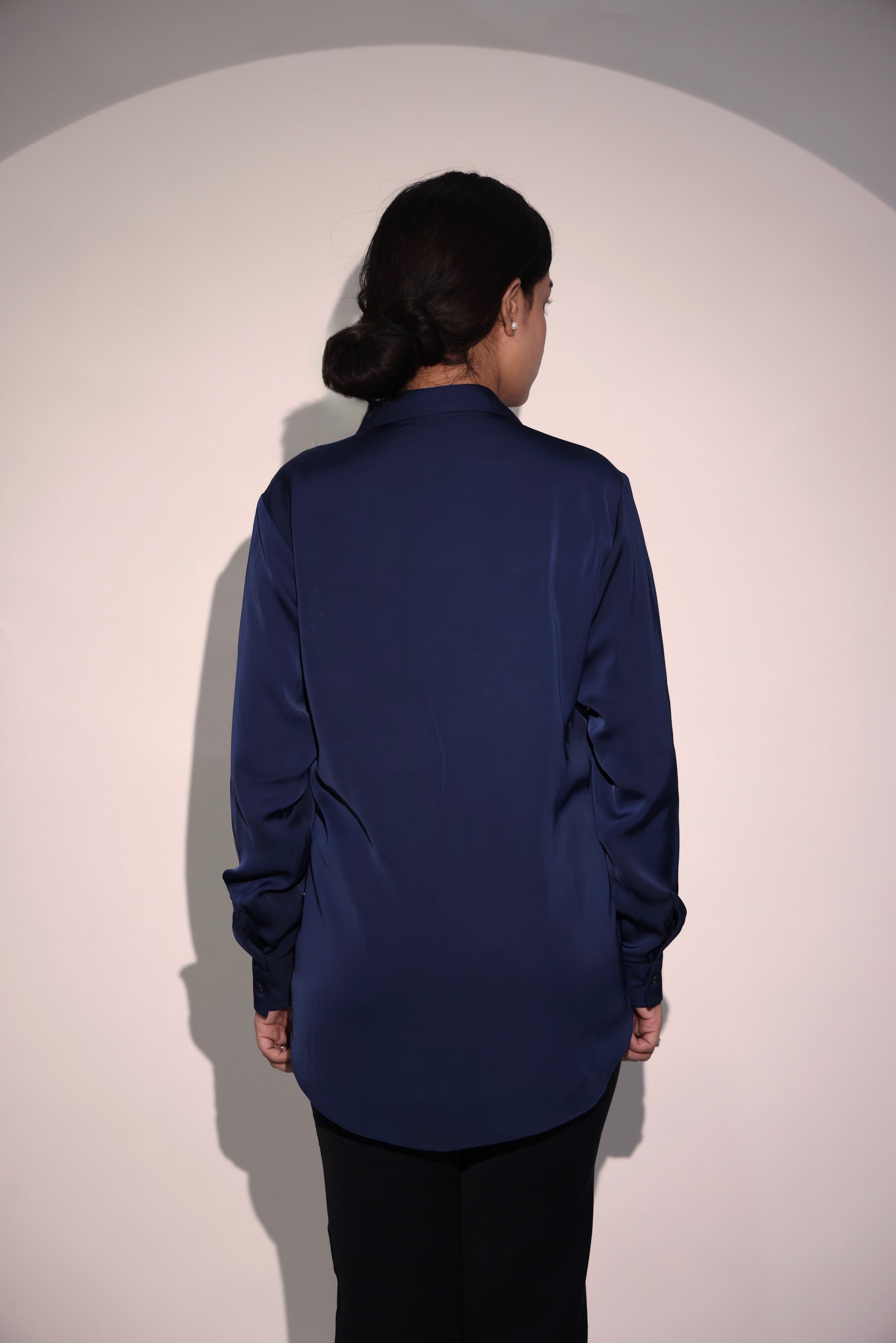 Satin-finish navy shirt exuding understated elegance with a touch of glamour. Designed with a concealed placket for a clean, streamlined front, the standout detail lies in its pearl-embellished collar — adding a refined, contemporary twist to a classic silhouette.
