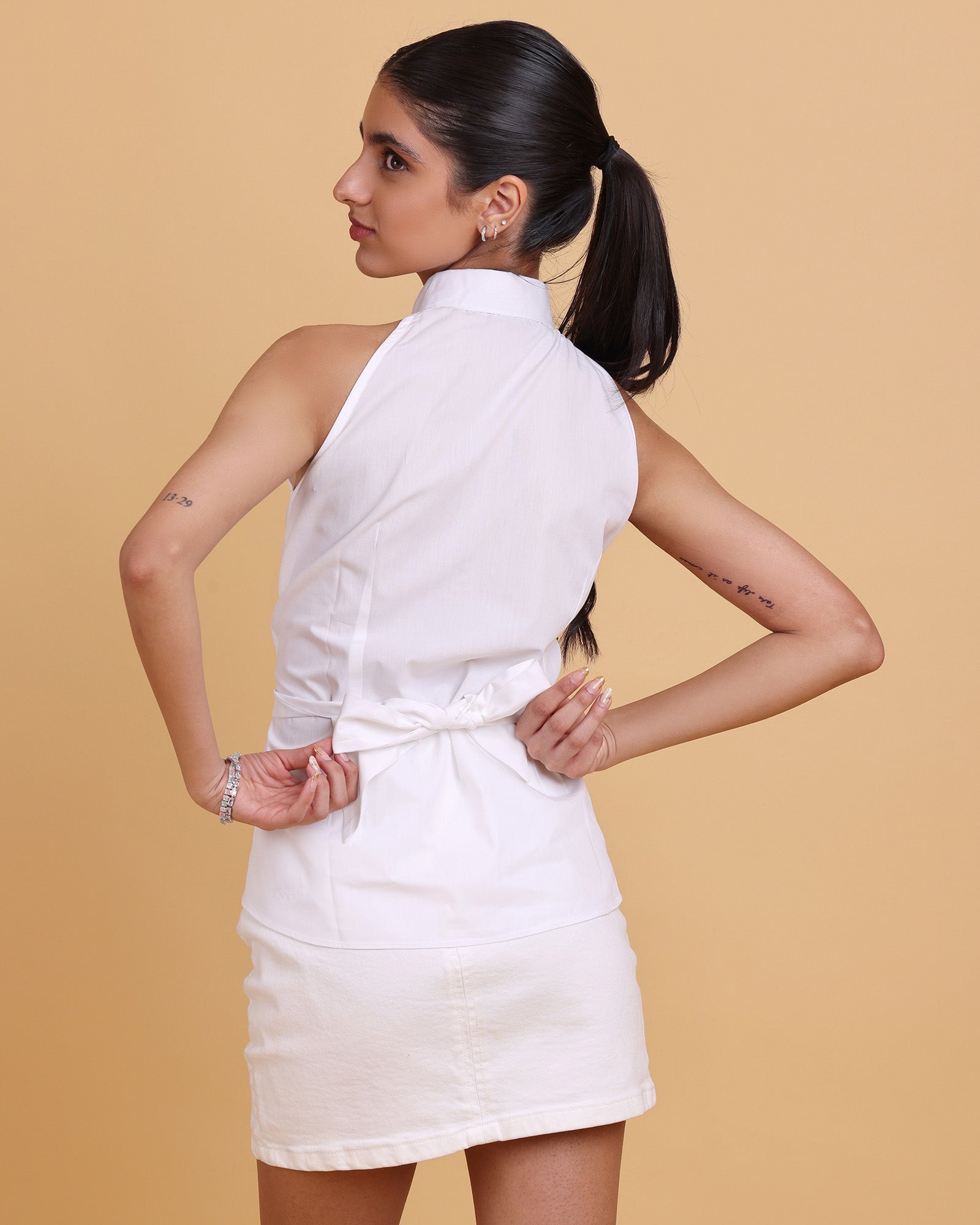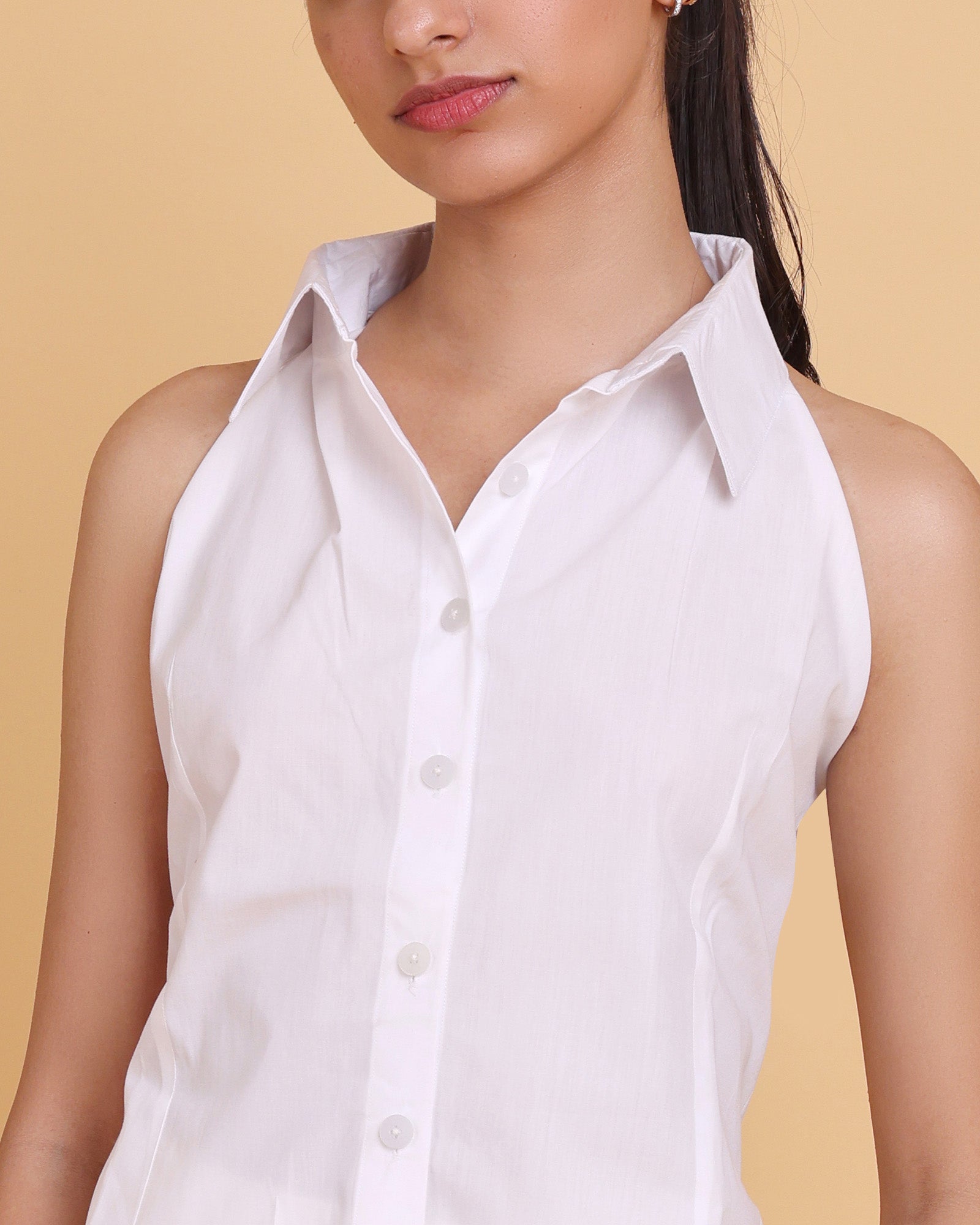 A study in minimal elegance, the Diana Dove Shirt features a sleeveless cut and sharp collar in pristine white cotton. Tailored seams sculpt the body, while the clean button-down design delivers timeless sophistication for effortless, refined day-to-evening dressing.