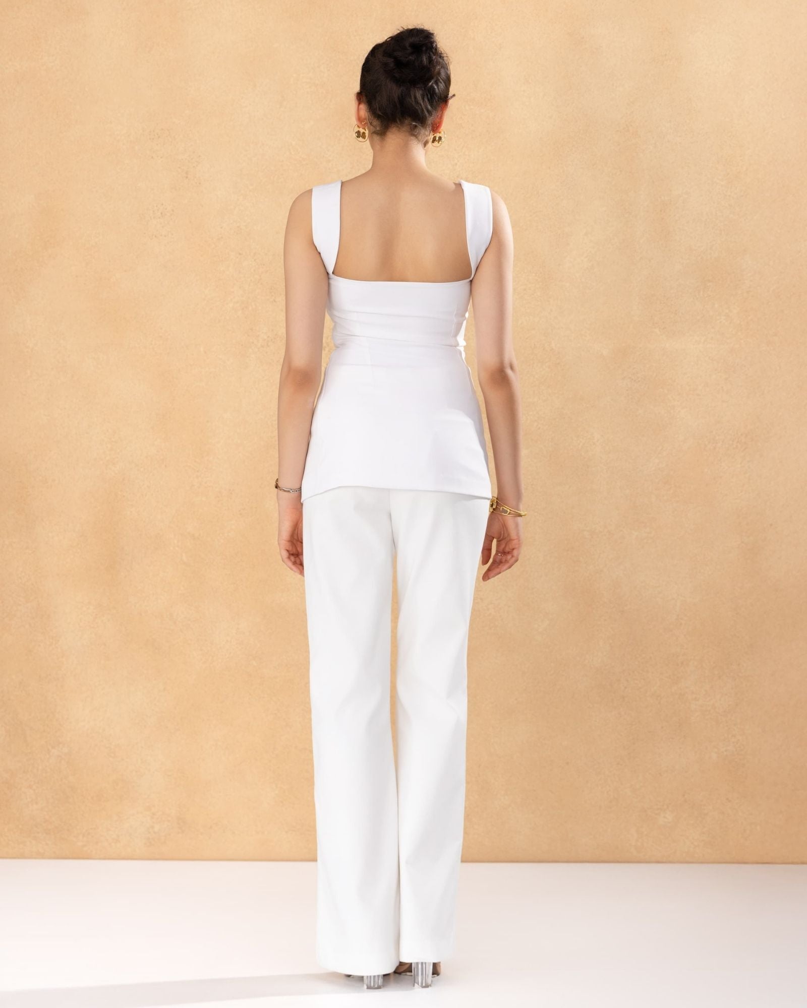 - Longline fitted top with a clean square neckline paired with tailored flared pants