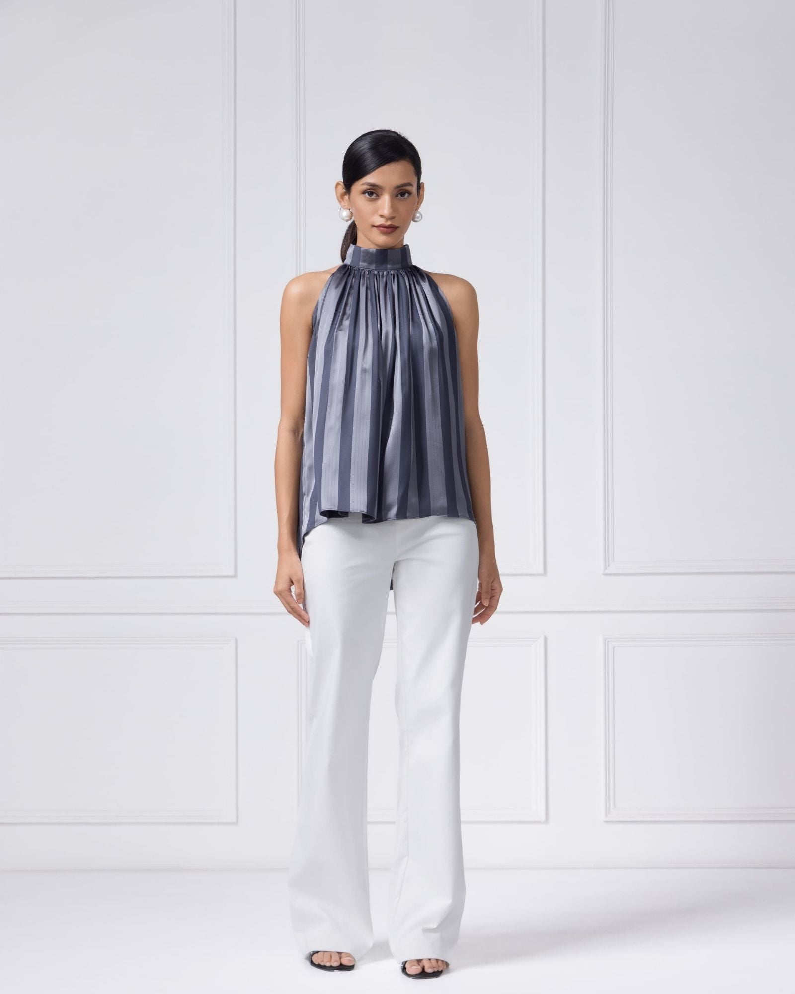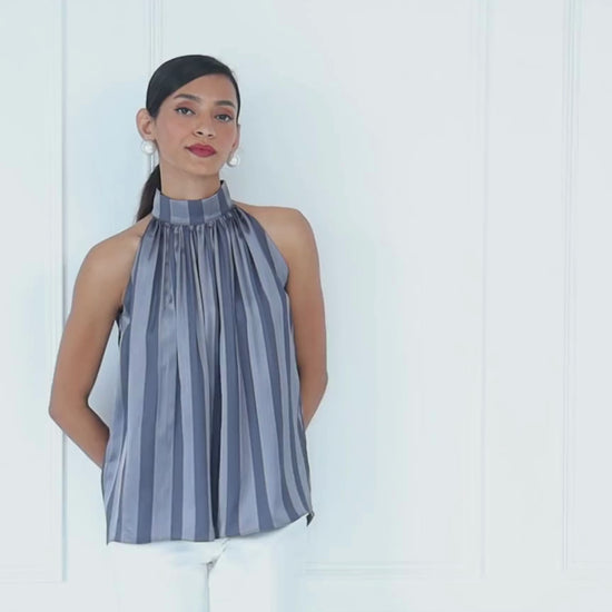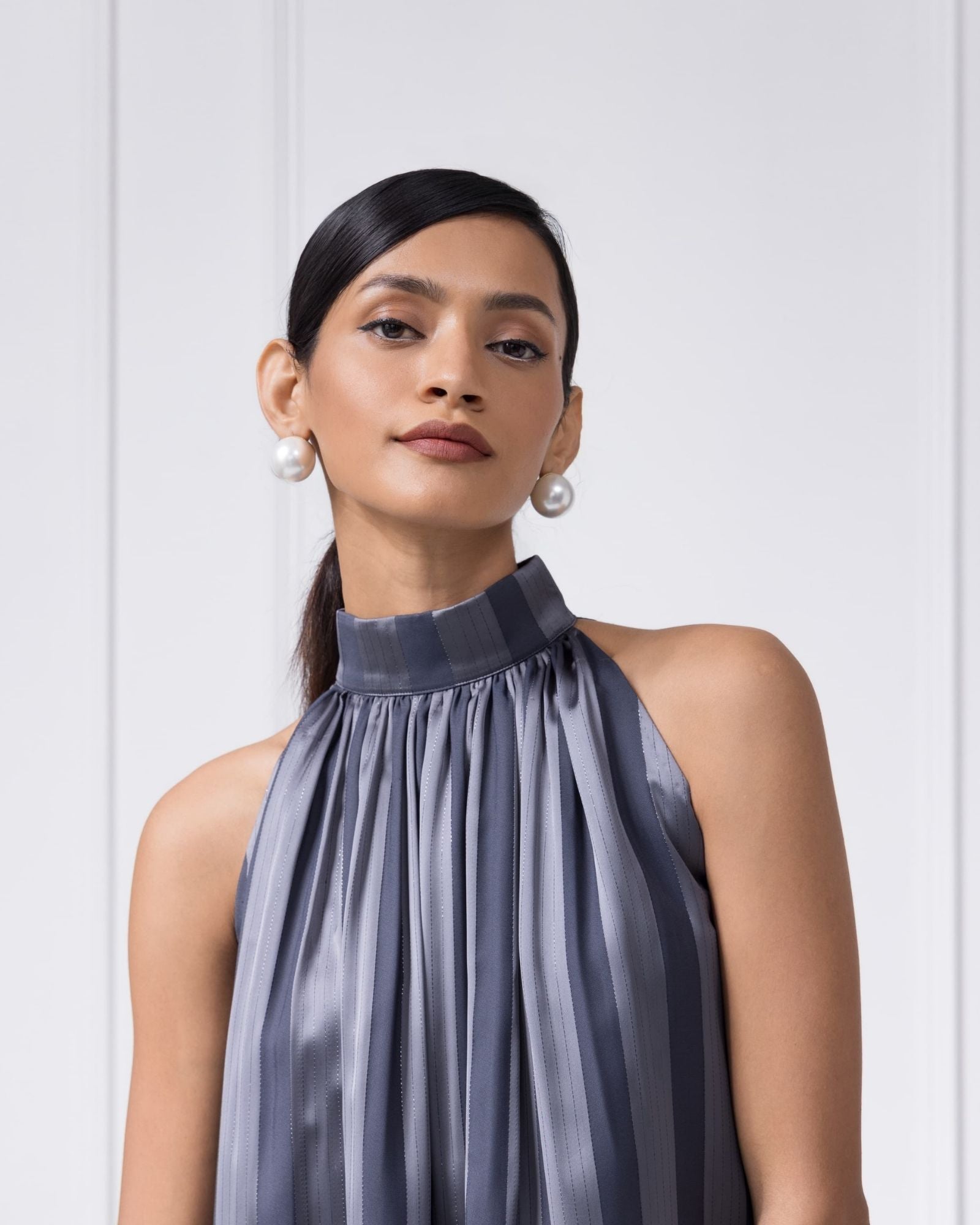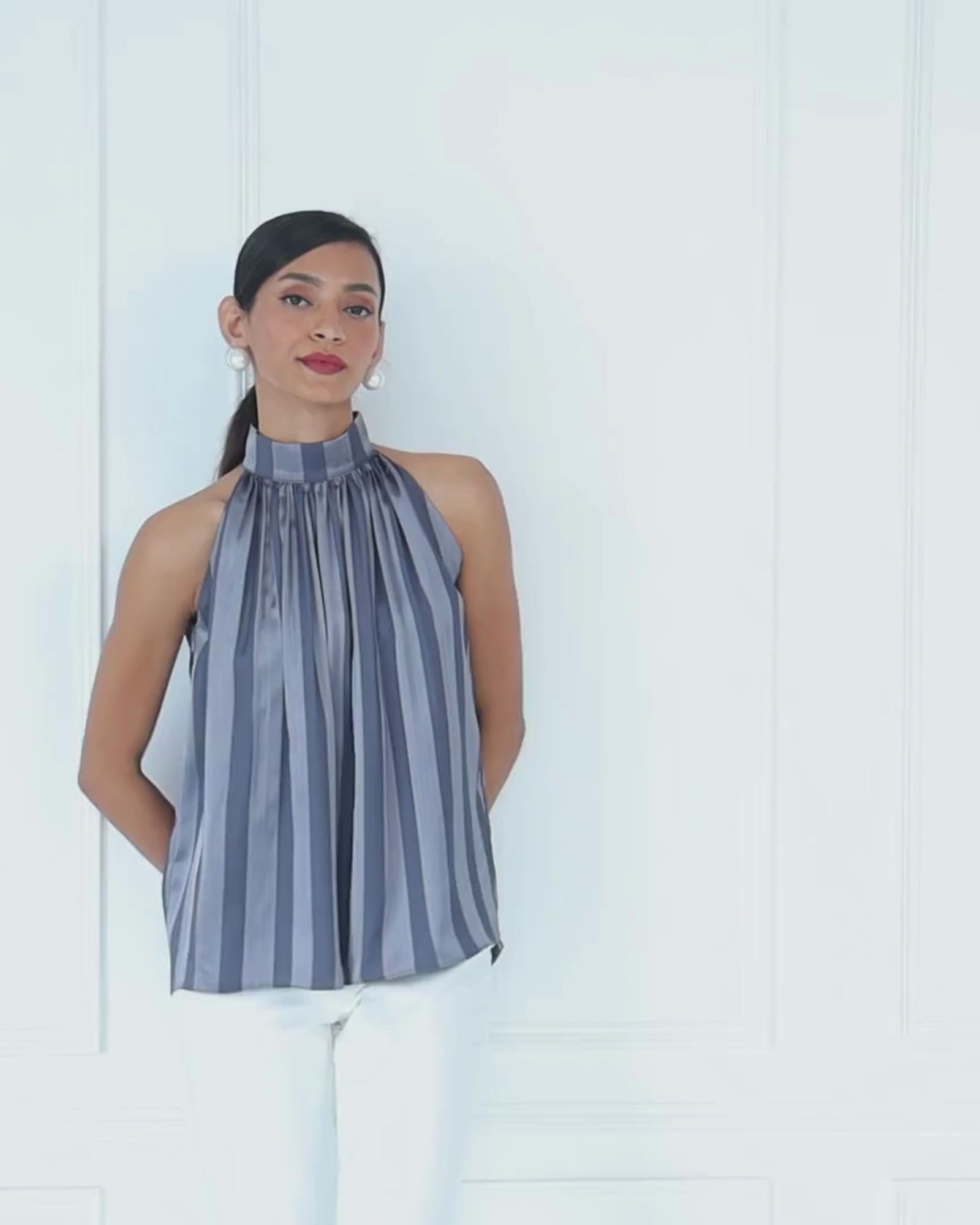 The SOFT ECLIPSE TOP is a vision of fluid elegance, with its lustrous steel-grey satin gently catching the light. Designed with a high gathered neckline, this top exudes contemporary grace, while the cascading veil-like back creates a dreamy, ethereal flow. The high-front hem balances the silhouette, making it perfect for both chic evenings and sophisticated daywear.