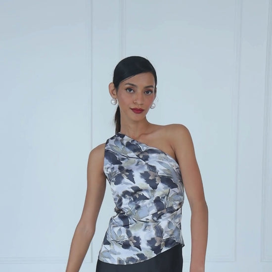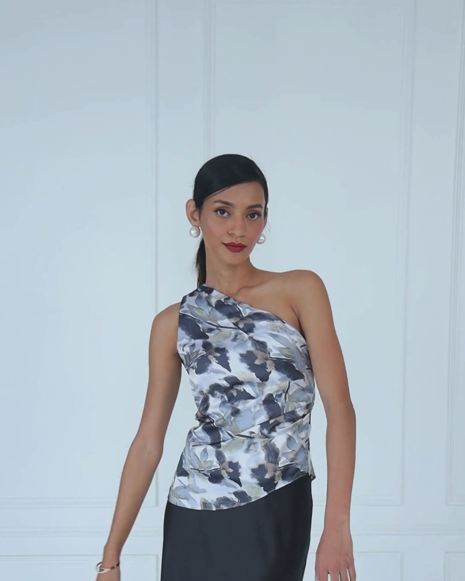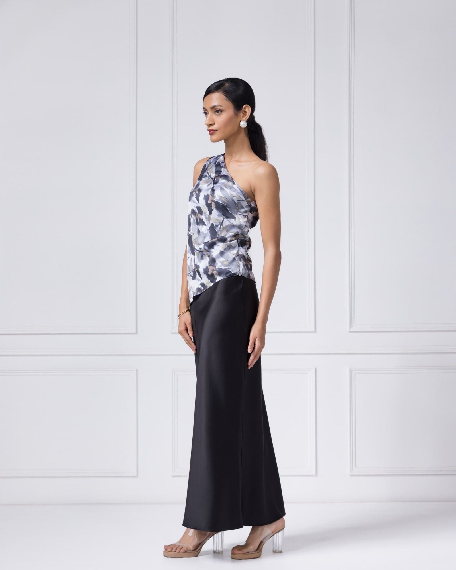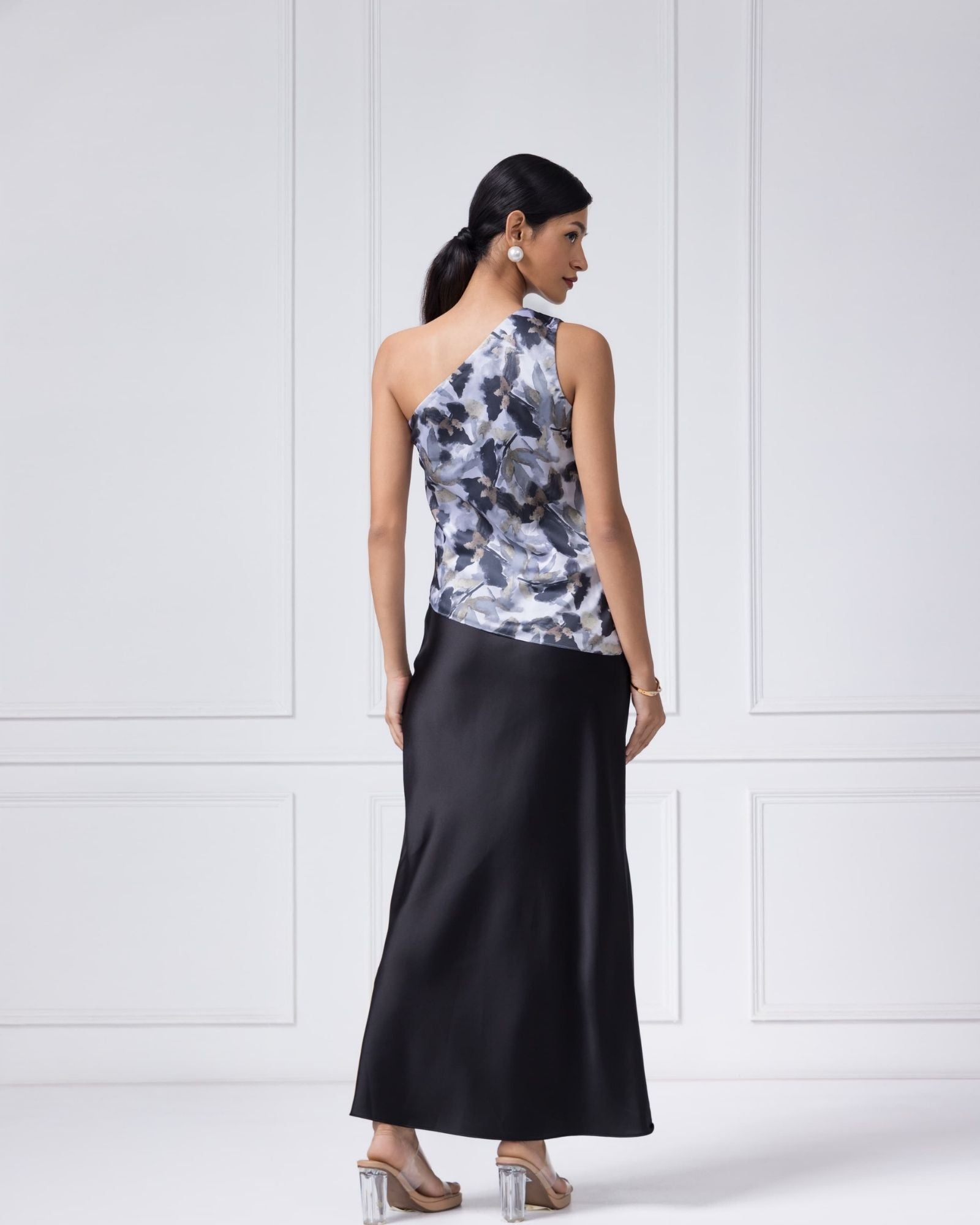 The signature printed top turns heads with its asymmetric neckline and soft drape, while the bias-cut satin skirt flows with a silky ease that feels just right. Together, they’re the kind of pieces you pack first — because you’ll reach for them again and again.