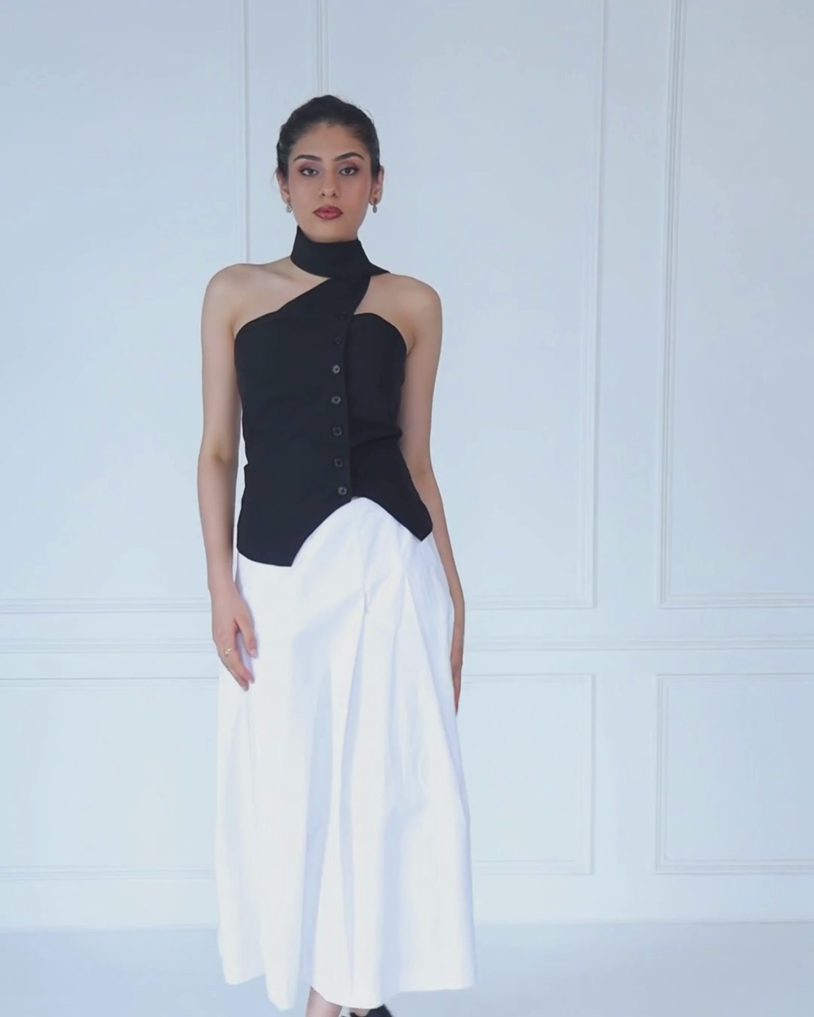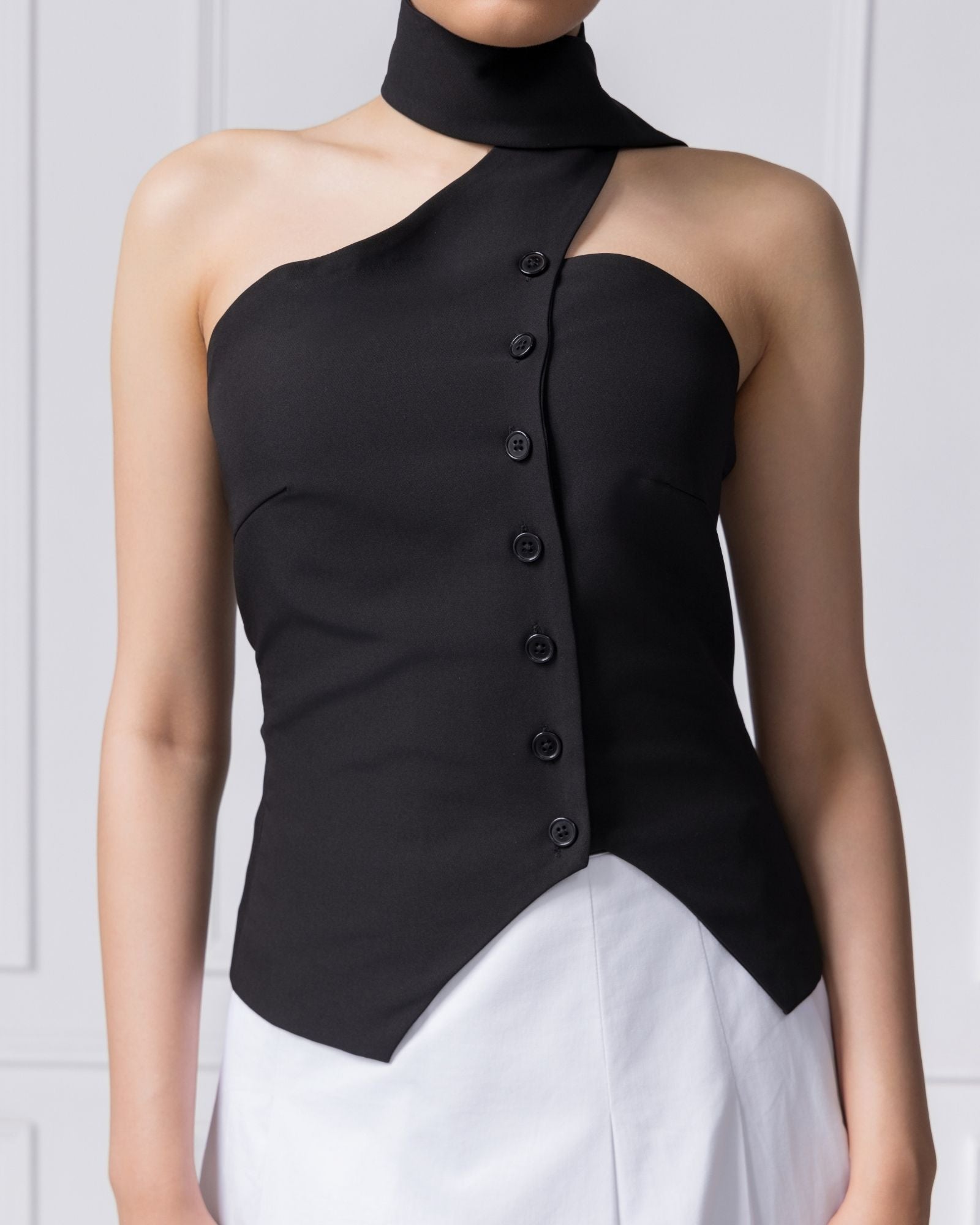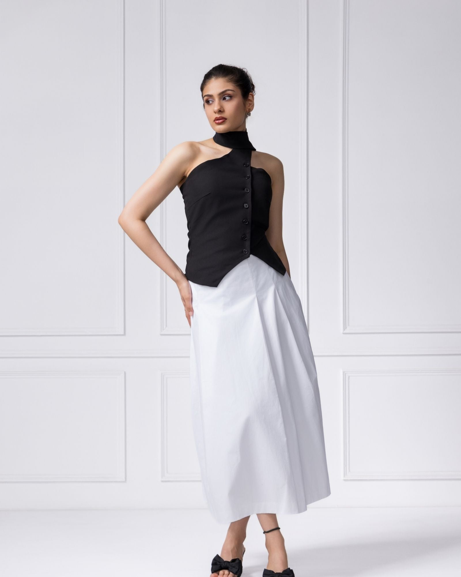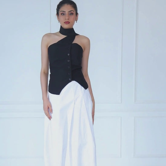 Where structure meets fluidity, THE DRAPE TOP is an ode to contemporary elegance. The bold, asymmetric neckline wraps into a sculpted collar, creating a striking silhouette that feels both architectural and sophisticated. A line of delicate buttons flows diagonally, adding movement and intrigue to the form.