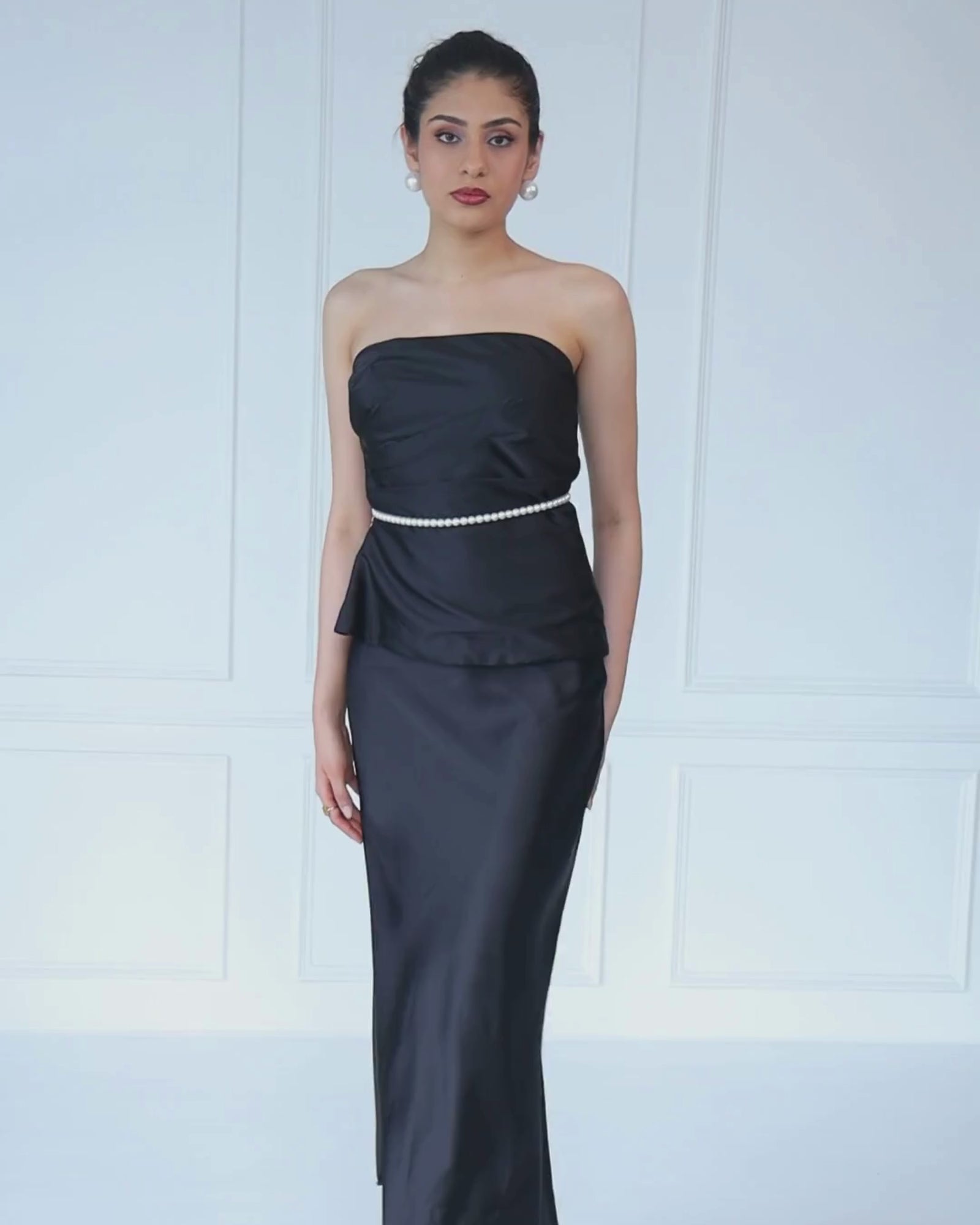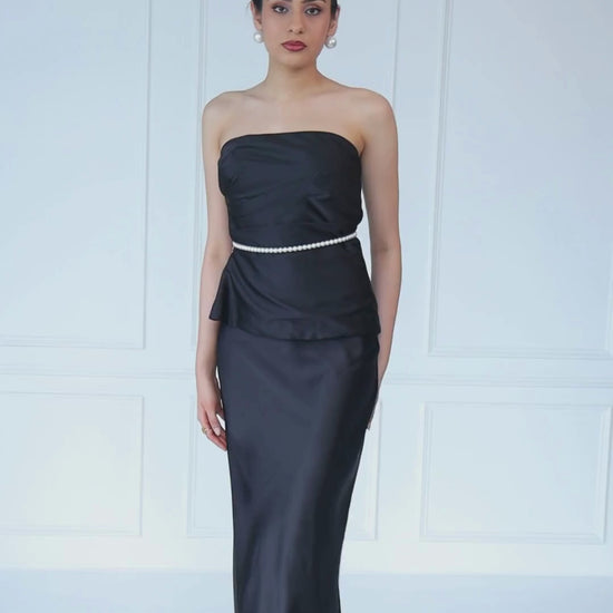 Sculpted in a sleek black satin finish, this strapless top contours the body with quiet allure. It comes paired with a detachable pearl belt, included in the fit, adding a refined, feminine accent to this effortlessly polished silhouette.
